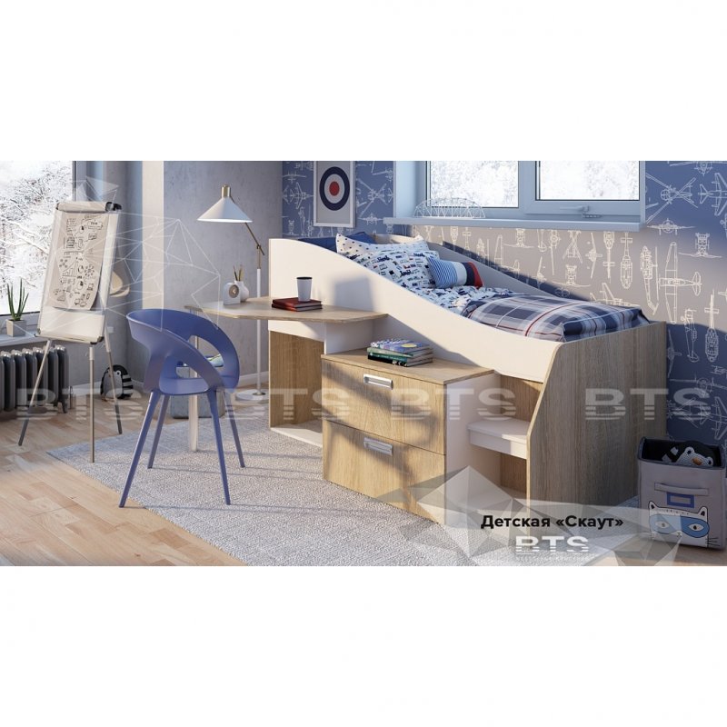 Европейский стиль и ультрамодное сочетание цветов в детской «Скаут» позволит поставить данную композицию в комнату как для мальчика, так и для девочки. При помощи декоративных элементов Вы легко обыграете детскую ребёнка. Компактная композиция удачно впишется в небольшое помещение или уголок малыша. Удобная кровать, стол, выдвижные ящики – все эти элементы заняли минимум полезной площади комнаты, обеспечив при этом необходимую функциональность.