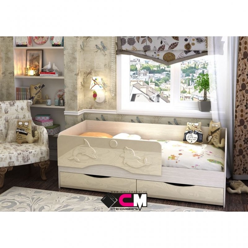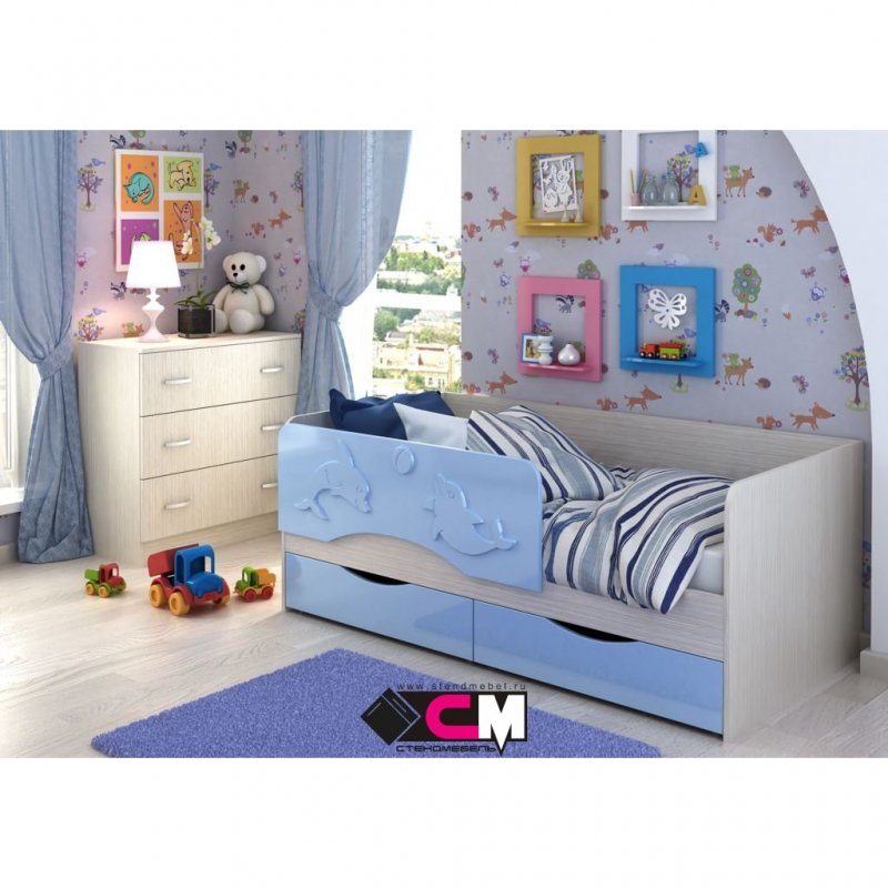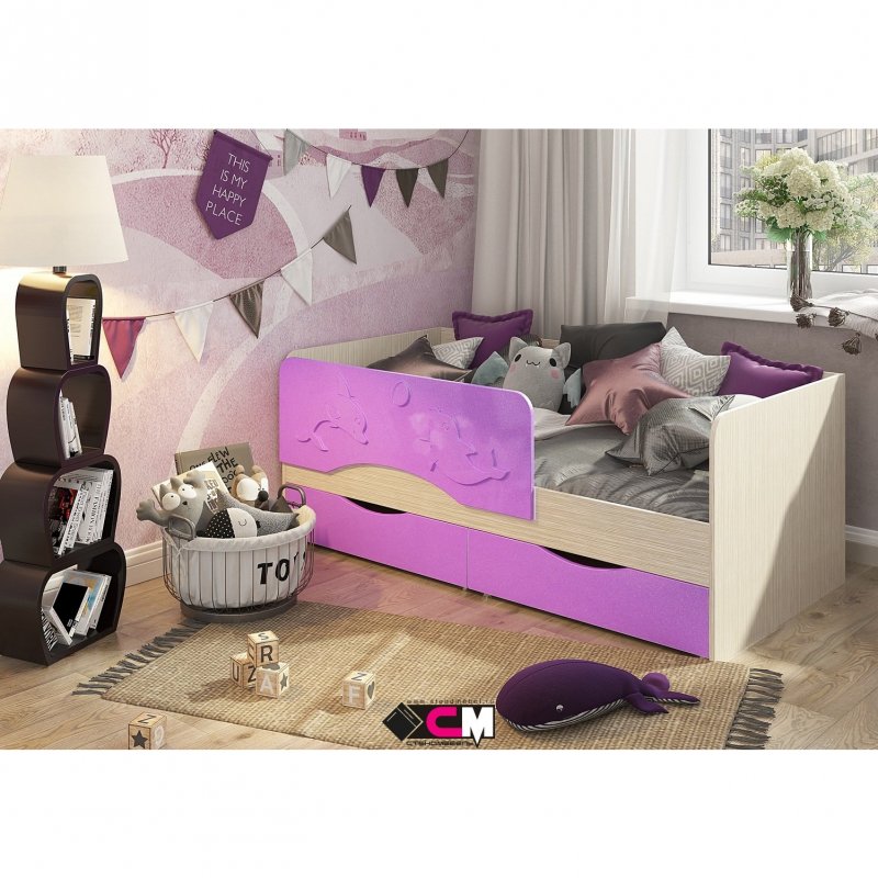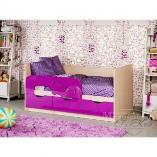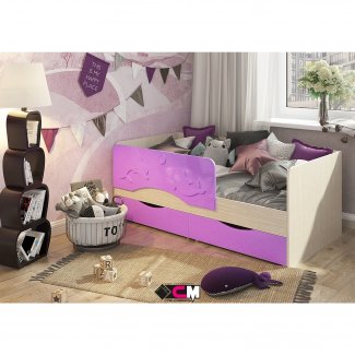 Детская кровать, в виде небольшого диванчика с ящиками- удобная и компактная.Небольшой размер кровати можно расположить в небольшое помещение.Перегородка, которая крепиться сбоку кровати служит ограничителем для детей.