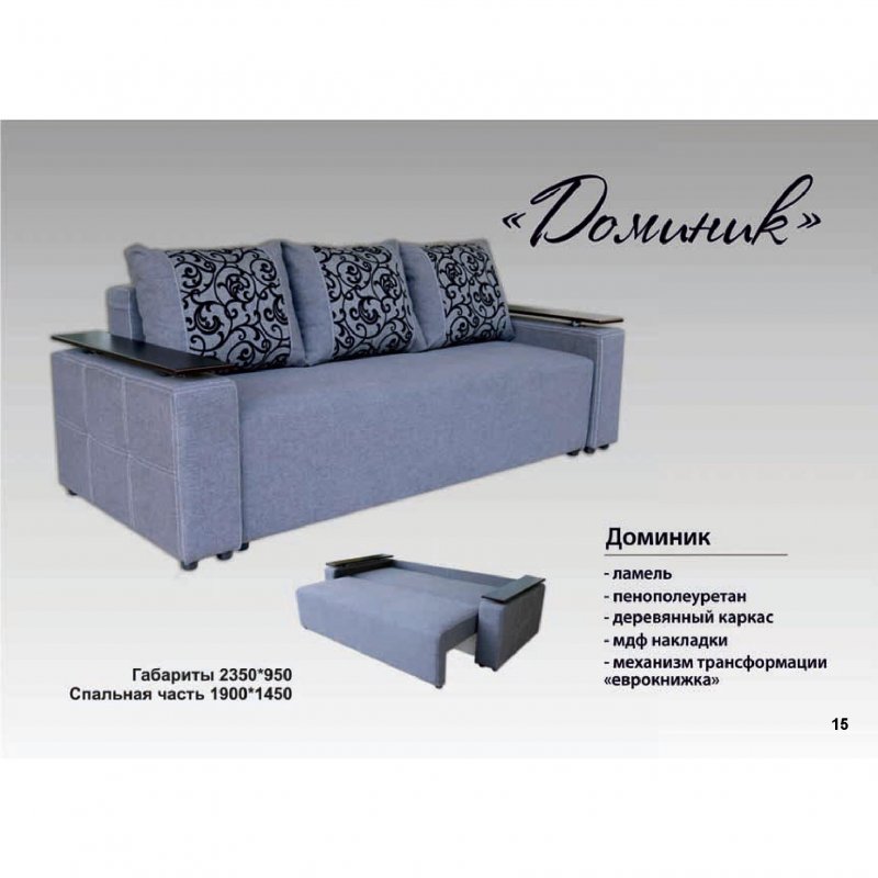 ДЛИНА (габарит), мм::2350ШИРИНА (габарит), мм::1500-в разложенном видеДЛИНА (спальн.место), мм::1900ШИРИНА (спальн. место), мм.:1450МЕХАНИЗМ РАСКЛАДКИ::ЕВРОКНИЖКАНАПОЛНЕНИЕ::ЛАМЕЛЬ+ППУТКАНЬ::ПО ВЫБОРУ