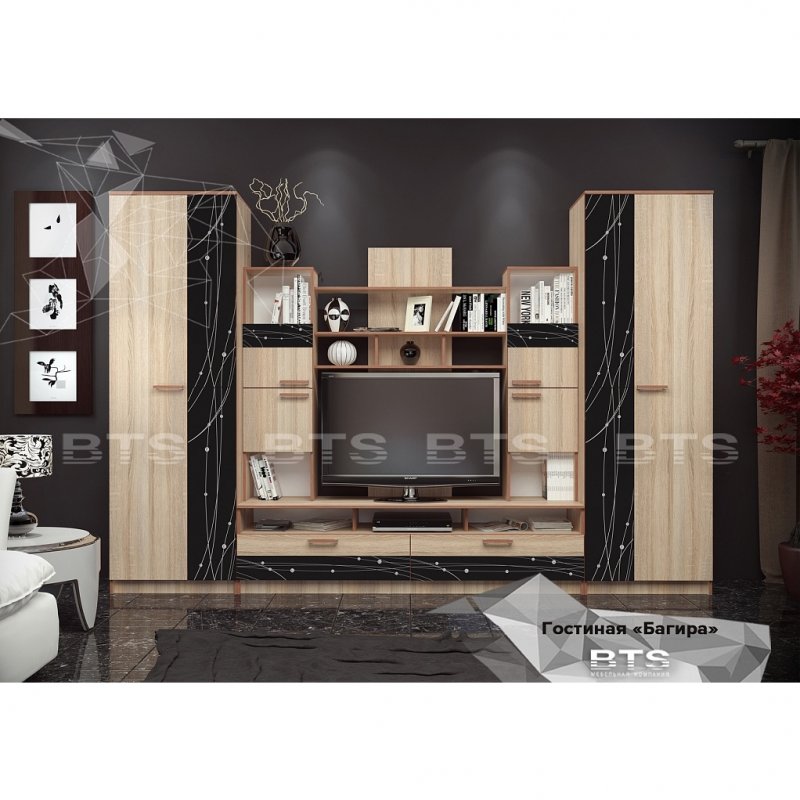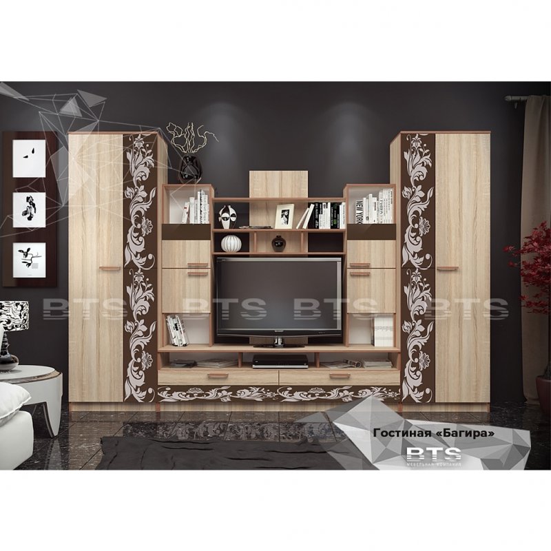 Грациозная и функциональная гостиная изготовлена из самого модного декора этого сезона «дуб сонома» – трёхмерная текстура с заметными следами распила. Характерными деталями являются сочетание светлых и темных пор (эффект теней), сердцевидные лучи и поперечные следы пилы. Декоративные элементы на створках выполнены из стекла с двумя вариантами оформления. «Кашемир» – это нежные контрастные линии, а «каштан» – это флористичный принт. Одна эта деталь кардинально меняет общий вид гостиной, подчеркивая индивидуальный стиль обладателя.
