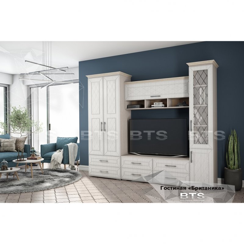 Современная классика в благородном сочетании цветов «айвори» и «дуб атланта» неизменна и актуальна во все времена. Гостиная «Британика» рождает уникальный по внешней привлекательности и функциональности интерьер. Матированное стекло с алмазной гравировкой повторяет рисунок фасада в виде ромбов, который завершает общий образ гостиной. Красивые переливы света на витринах «Британики» напоминают роскошное сияние драгоценных камней. Величественность гостиной придает эффектный карниз из МДФ
