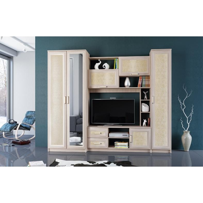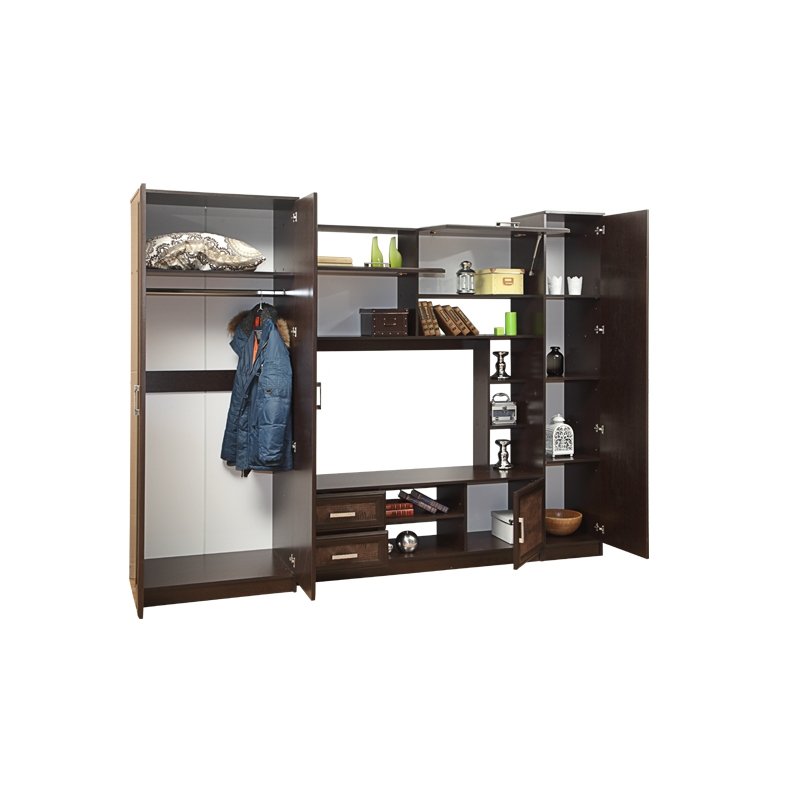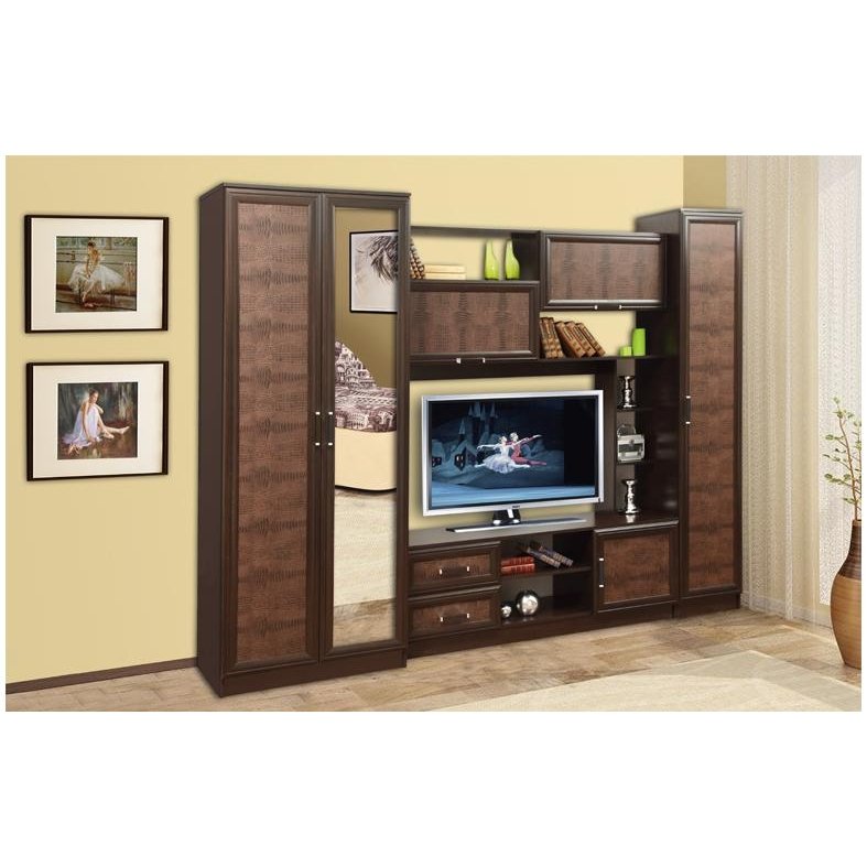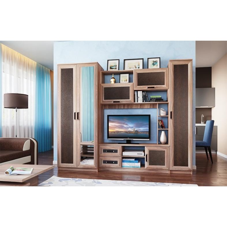 Стенка «Глория-6Н» – удобное решение для организации пространства в гостиных комнатах и кабинетах. Он включает шкаф для одежды, стеллаж с дверью, несколько закрытых и открытых полок и два выдвижных ящика. В центре расположена открытая секция для телевизора. Комплект максимально удобен в эксплуатации, так как позволяет разместить множество вещей различного назначения: одежду, книги, вазы, предметы декора, аудио- и видеотехнику. Изделие оформлено в цвете тёмной древесины, оснащено зеркалом и эффектной фурнитурой. Возможна левосторонняя или правосторонняя сборка.Возможен вариант сборки как на левую, так и на правую сторону.