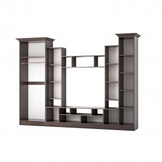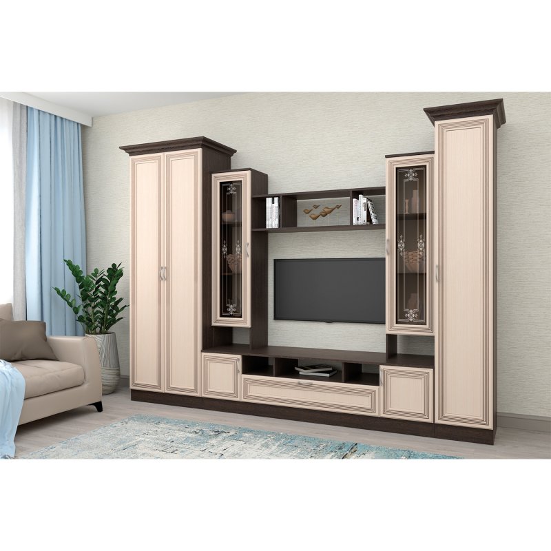 Элегантная, стильная и функциональная Включает в себя: шкаф платяной со штангой и пенал с полками для белья, две витрины с дверками со стеклом. Удачное сочетание открытых и закрытых секции