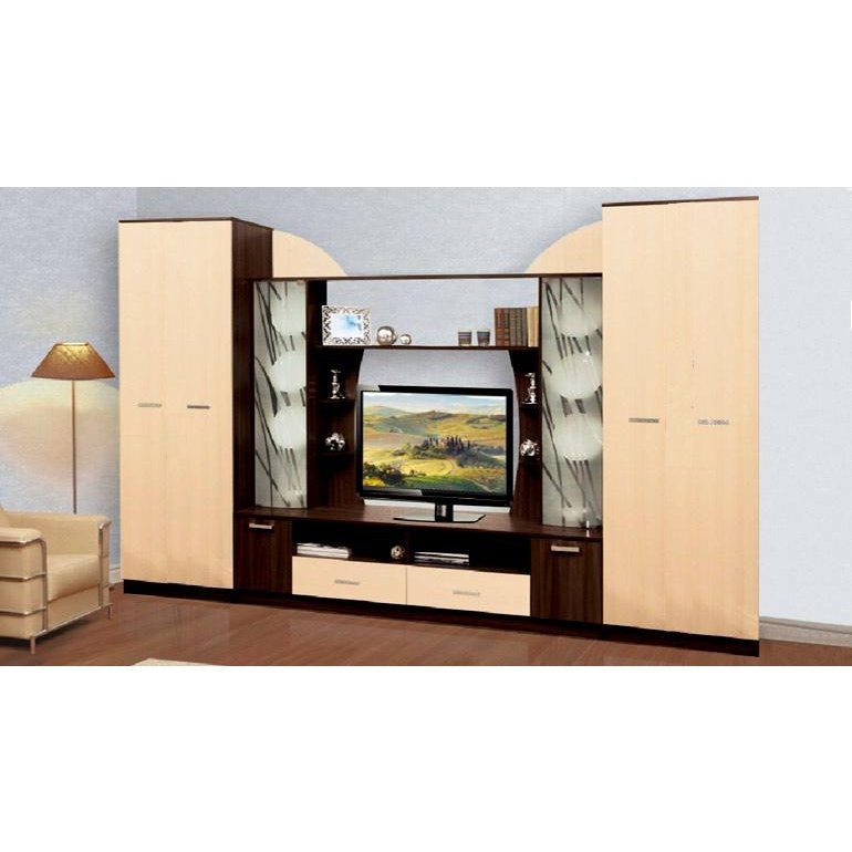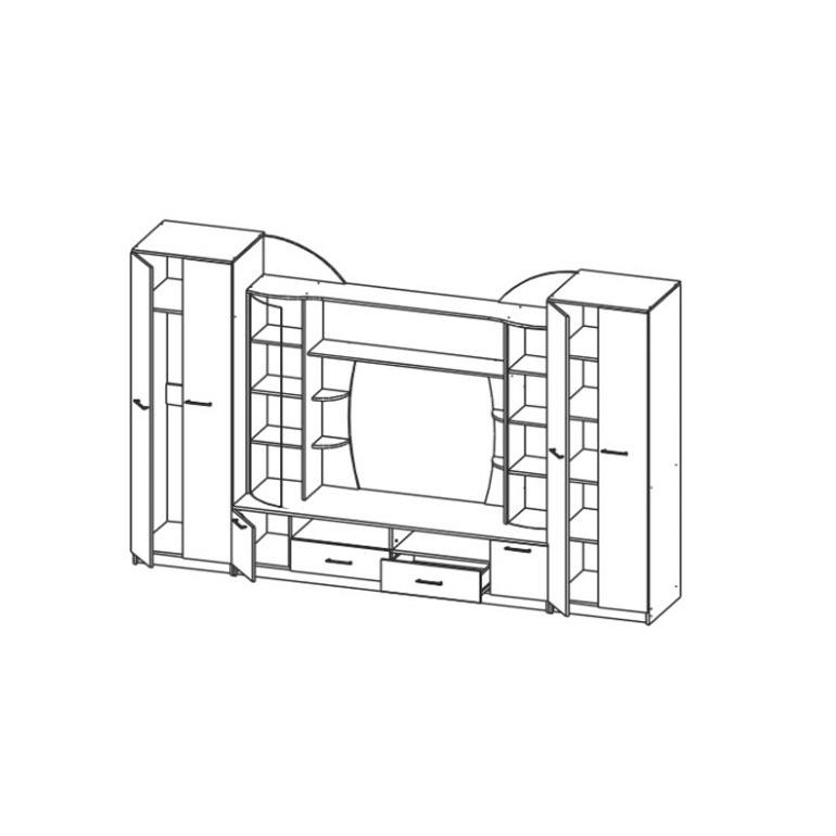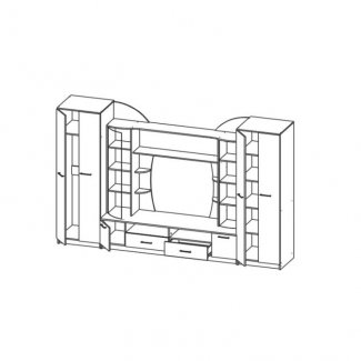Стенка «Софи NEW» – это эффектная мебель, состоящая из двух двустворчатых шкафов и центральной секции. Один из шкафов имеет внутри штангу для вешалок, а другой – вместительные прочные полки. Фасады украшаются нетривиальными вставками, сочетающими контрастные оттенки. В центральном отделе предусмотрены полки, ниши со стеклянными дверцами для красивой посуды, сувениров, выдвижные ящики и небольшие отделы с распашными глухими дверцами. Гостиная устанавливается на цоколь.