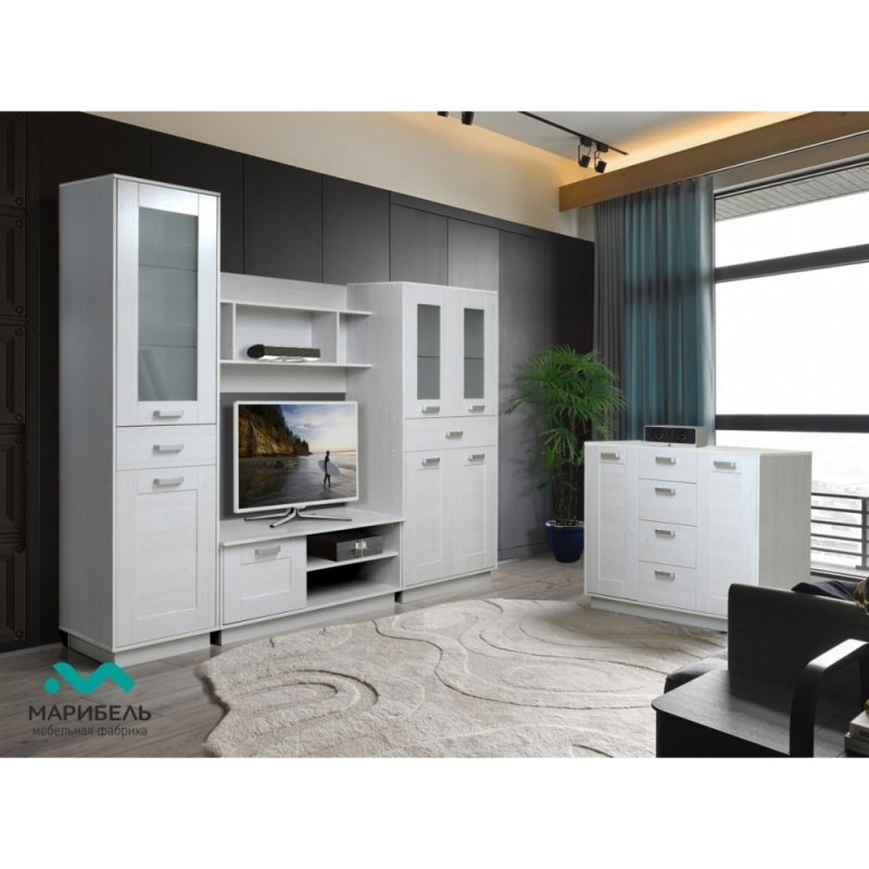 Современная гостиная "Волжанка" в светлых тонах отлично впишется в любой интерьер. Стенка украшена вставками из стекла и вместительными полками.