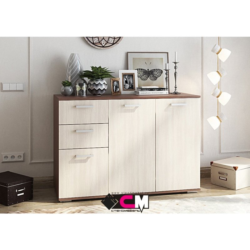 Модель состоит из вместительной тумбы, двух выдвижных ящиков и небольшой тумбы. расположенной под выдвижными ящиками. Надежная фурнитура и современная система направляющих.
