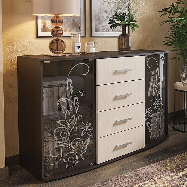 Внешний вид комода пленяет, а богатое внутреннее наполнение превращает в эталон функциональности. Фасад из тонированного стекла, украшенного пескоструйным рисунком.