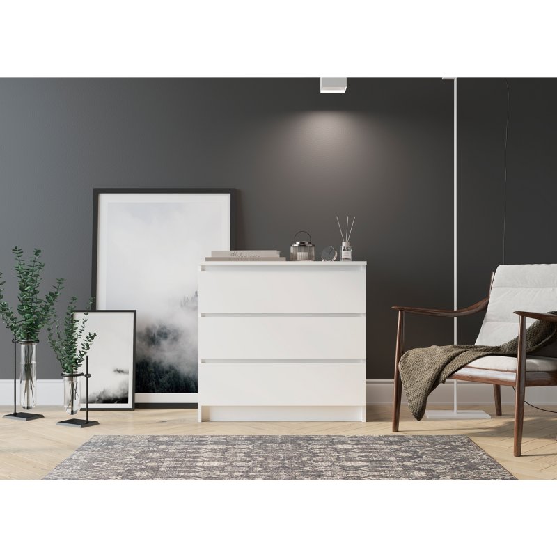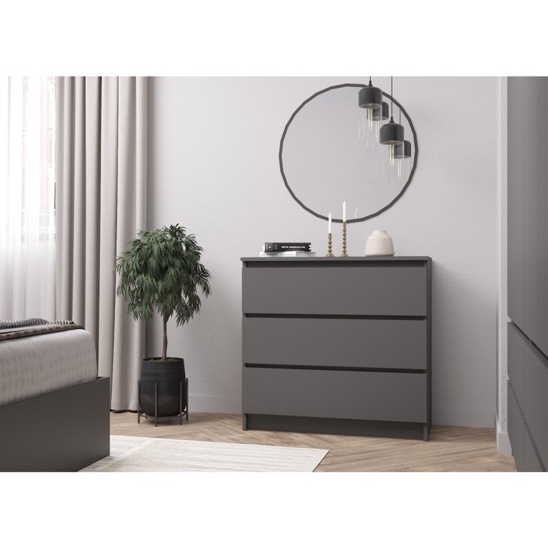 Комод "МОРИ" коллекция представлена в двух актуальных оттенках этого сезона-в минималистичном белом и в сдержанном графите.Данные цвета не потеряют своей актуальности в течение долгого времени,а так же помогут создать строгий и изысканный стиль в интерьере.Отсутствие  ручек-главное преимущество данной модели.Роль ручек выполняют сами фасады.Открывание ящиков производится за счет пространства между планками и фасадами.