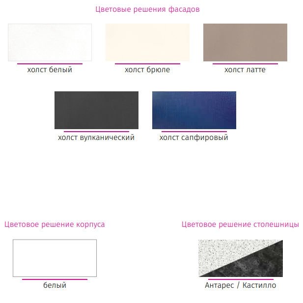ЦВЕТ ФАСАДА -ХОЛСТ БЕЛЫЙ, ХОЛСТ БРЮЛЕ, ХОЛСТ ЛАТТЕ, ХОЛСТ ВУЛКАНИЧЕСКИЙ, ХОЛСТ САПФИРОВЫЙ (фото фасадов см. ниже ).