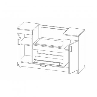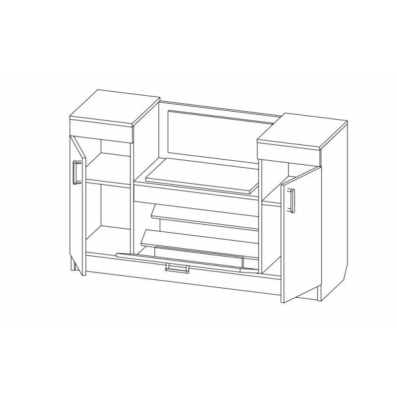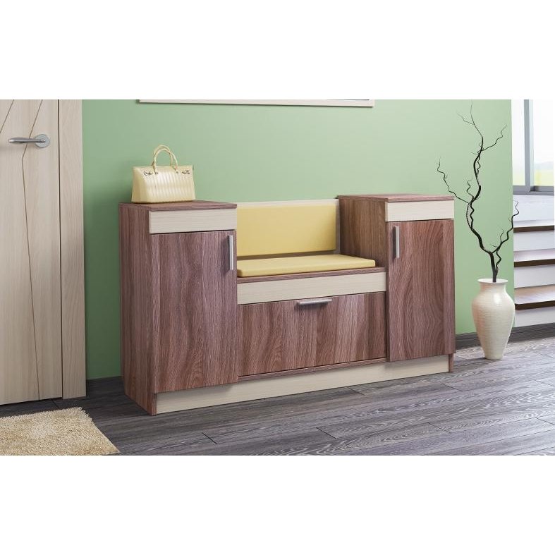 Оригинальная обувница «Фиеста-2» – замечательное решение для прихожих небольших размеров. Её стильный дизайн невольно бросается в глаза и обеспечивает помещениям более привлекательный вид. Слева и справа от центральной части расположено два вместительных отсека с распашными дверцами. Между ними имеется мягкое удобное кресло, под которым предусмотрена секция с дверцей откидного типа. Все фасады тумбы оснащены удобными ручками серебристого цвета и привлекают внимание оригинальным дизайном за счёт контрастной цветовой гаммы. Поверхности боковых отсеков можно использовать как подставки для сувениров или ваз с цветами.