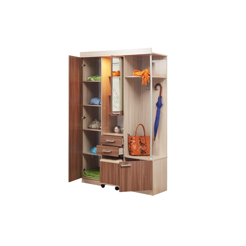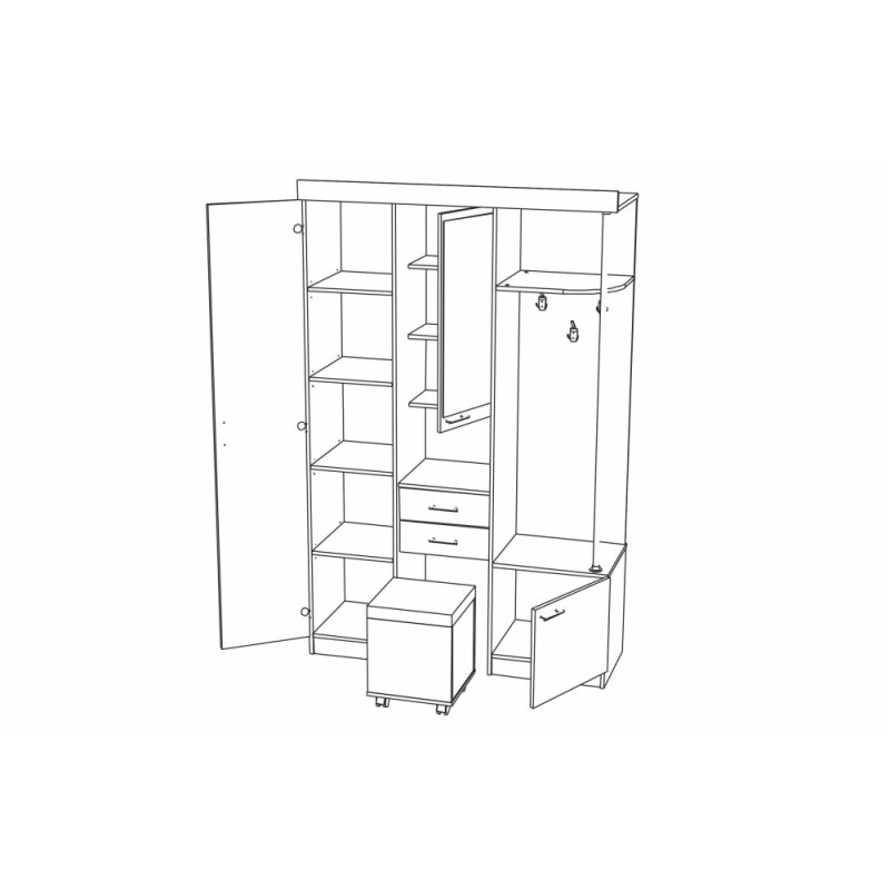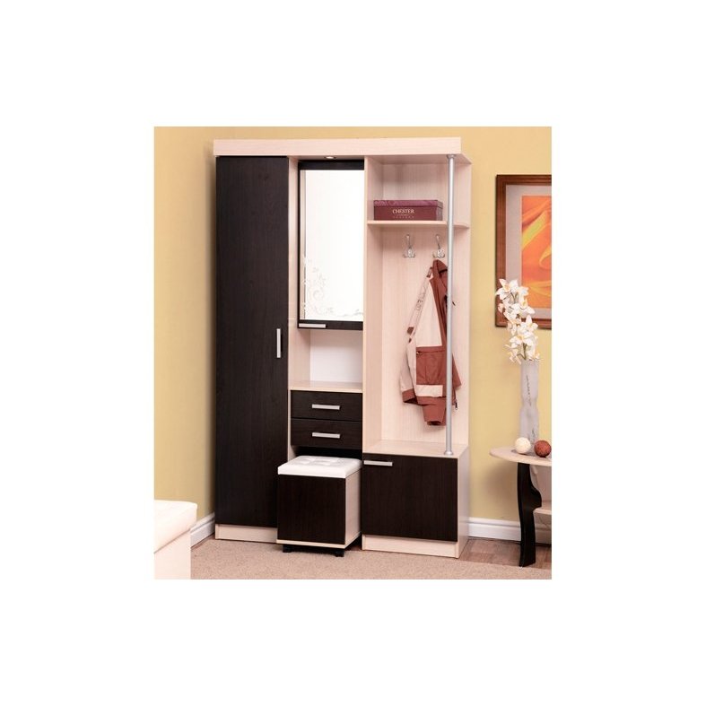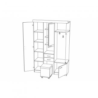 Оригинальный шкаф для прихожей «Дебют-4» – качественная корпусная мебель, изготовленная с учётом требований современного пользователя. В конструкции предусмотрено всё необходимое для хранения верхней одежды, обуви, аксессуаров. В левой части шкафа имеется отсек с распашной глухой дверцей, а справа – открытый отдел с полочкой и небольшая закрытая ниша. В центре – небольшое зеркало, два выдвижных ящика и глубокая ниша, предназначенная для пуфа. Последний имеет мягкий верх из искусственной кожи и четыре колёсика, с помощью которых пуф можно легко передвигать с места на место. Сам пуф имеет своё место для хранения (открывается сверху).
