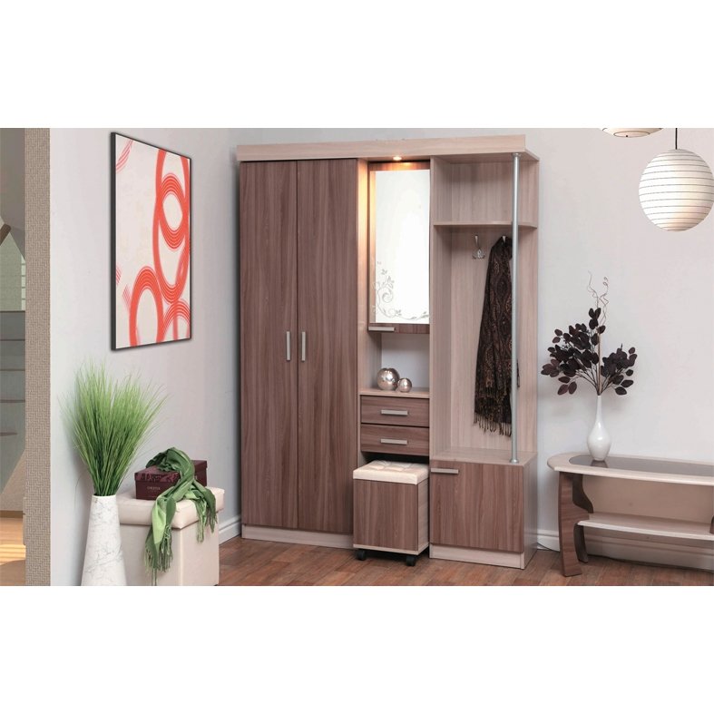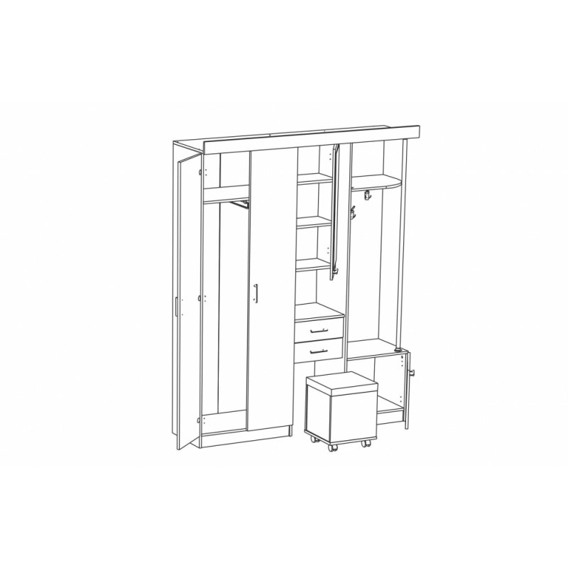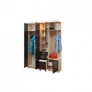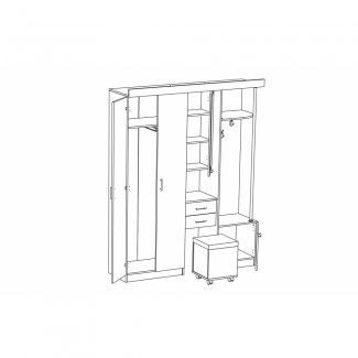 Это красивый, современный шкаф, способный стать практичным украшением любой прихожей. Он привлекает внимание превосходным функционалом, большим количеством отделений, полочек, оригинальным дизайном. С левой стороны имеется большой отдел с двумя распашными дверцами, справа – открытая секция с небольшой полкой и трубой-стойкой, которая опирается на ещё один отсек с распашной дверцей. В центре предусмотрены прямоугольное зеркало, ниша для хранения мелочей, два выдвижных ящичка и отсек для мягкого пуфа. Последний имеет четыре колёсика, с помощью которых можно передвигать пуф с одного места на другое. Сам пуф имеет своё место для хранения (открывается сверху).