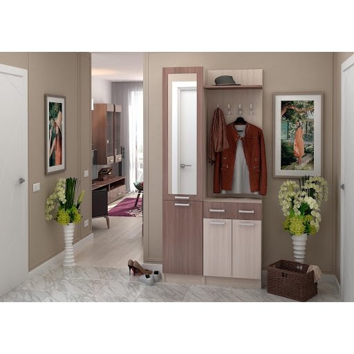 Прямой Комбинированный набор для прихожей имеет четыре двери ( три глухих, одну зеркальную) и один выдвижной ящик. Материал изделия соответствует всем стандартам качества.