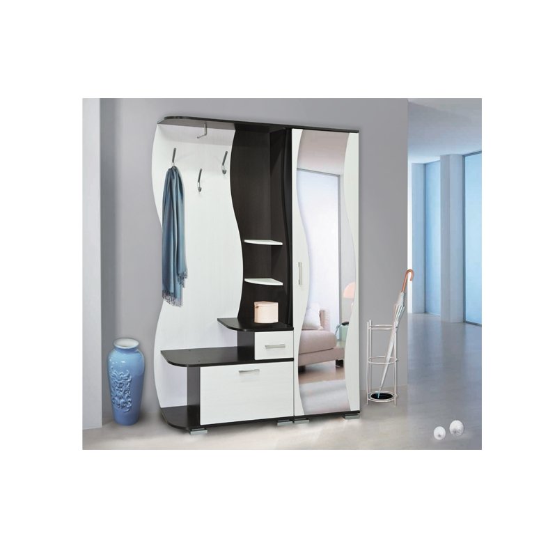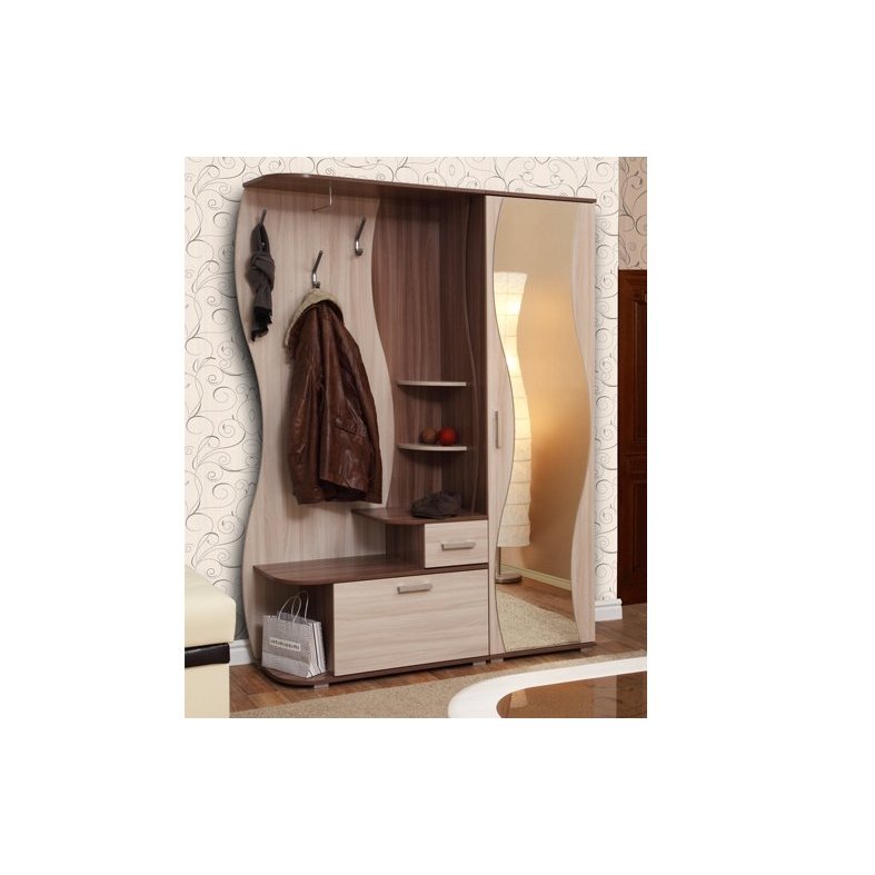 Красивая, современная конструкция, способная обеспечить помещению уют, комфорт и порядок. Плавные линии придают набору изящный, утончённый облик и отлично сочетаются со спокойной цветовой палитрой. Конструкция оснащается достаточным количеством полочек, которые можно использовать для хранения предметов гардероба и разных мелочей. Для размещения верхней одежды предусмотрены прочные крючки, а обувь можно убирать в большой нижний отсек с откидной дверцей.