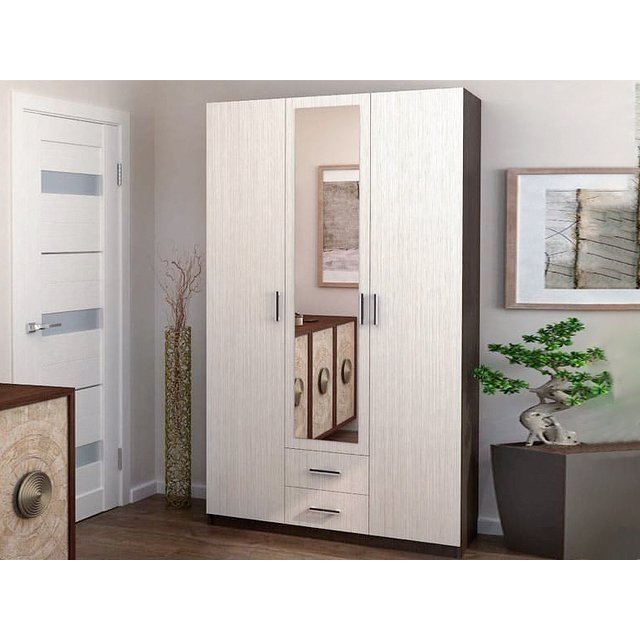 Современный многофункциональный шкаф-купе с зеркалом. Цветовые решения: корпус Венге, фасад дуб Белфорт. Корпус ясень Шимо темный, фасад ясень Шимо светлый.
