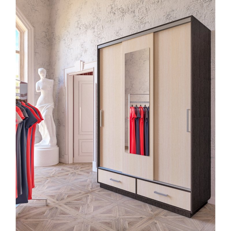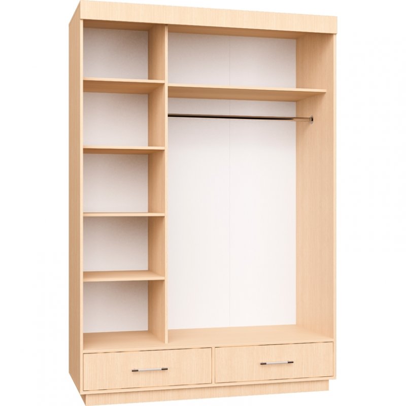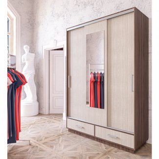 Шкаф-купе ШОН-5 – идеальный вариант для спальни. Всё потому, что модель содержит отсек со штангой, широкую полку сверху и 6 ниш в левой части шкафа. Также удобным местом для хранения станут два вместительных выдвижных ящика у основания изделия. У данного шкафа 3 купейных двери, средняя из которых с зеркалом. Благодаря подвесному механизму все они плавно передвигаются по металлическому профилю. Дополнить шкаф можно выдвижными ящиками и угловым стеллажом СПУ-1 с открытыми полками. Своими радиусными формами он сгладит острые углы и станет гармоничной точкой всего ансамбля.