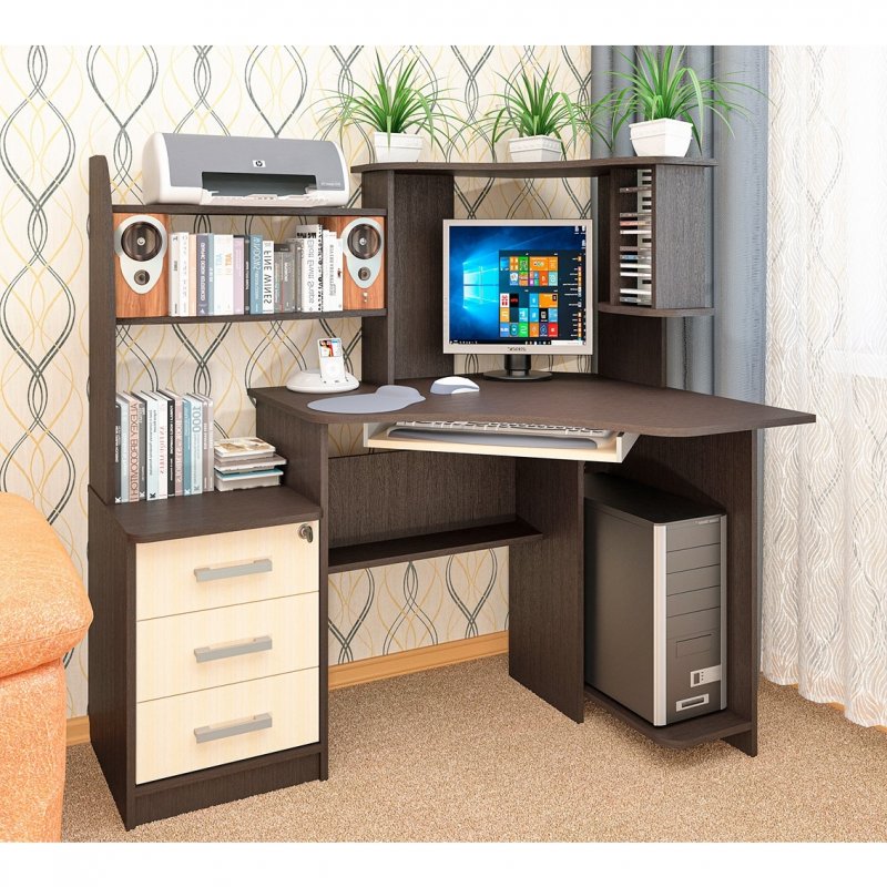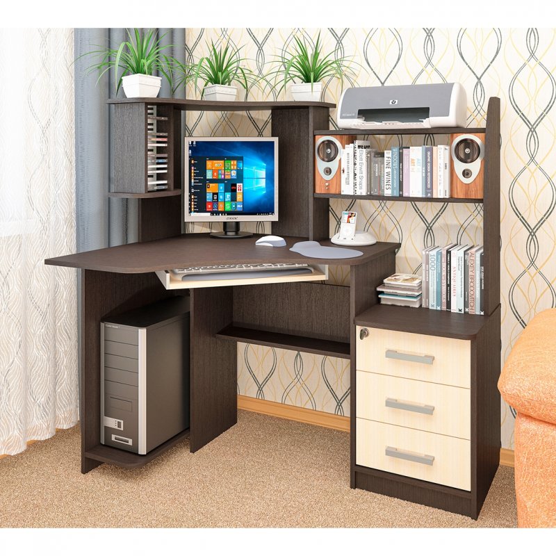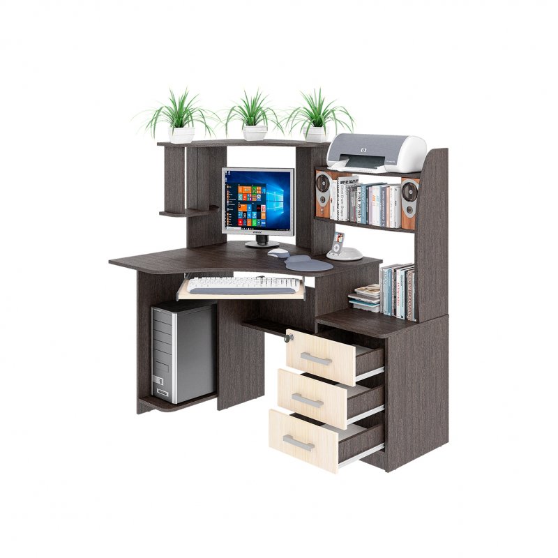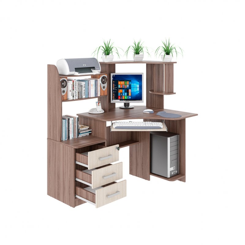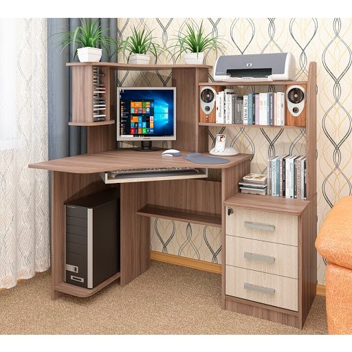 Угловая модель компьютерного стола обладает всеми качествами для продуктивной деятельности. В частности, стол имеет просторную столешницу, где можно установить монитор размером 52х48 см. Здесь же без труда можно заниматься письменными работами. Также оборудованы выкатная полка для клавиатуры, отсек для дисков и ниша под системный блок. Кроме того, под столешницей удобно расположилась полка для книг, а в правой части стола – три выдвижных ящика, один из которых закрывается на ключ.