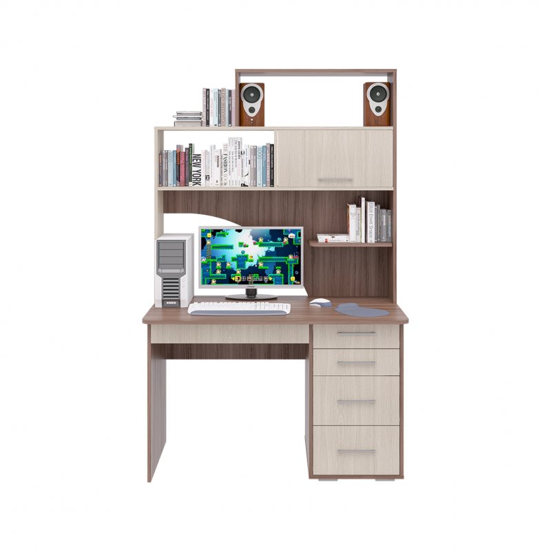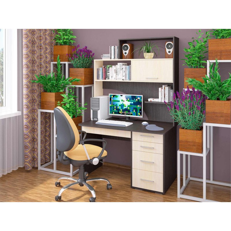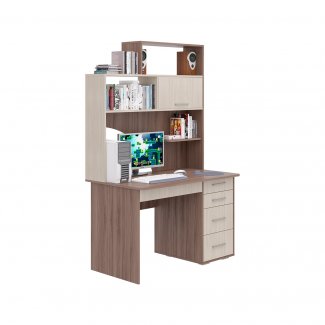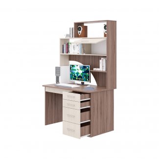 Стол имеет функциональную вместительную надстройку, строгие прямые линии и стильные ручки, закрытые ящики и открытые полки - все это придает изделию некую солидность.