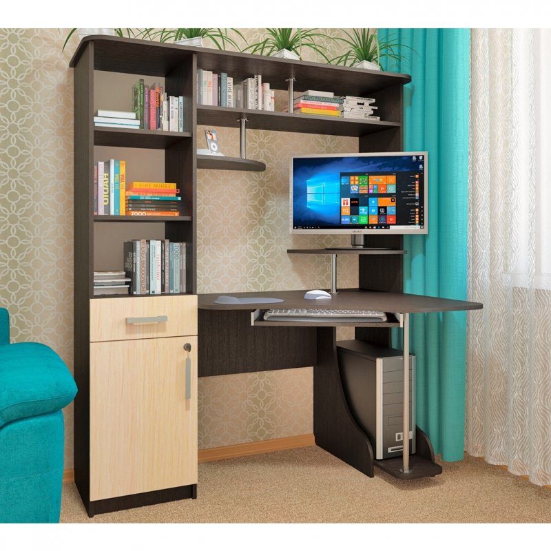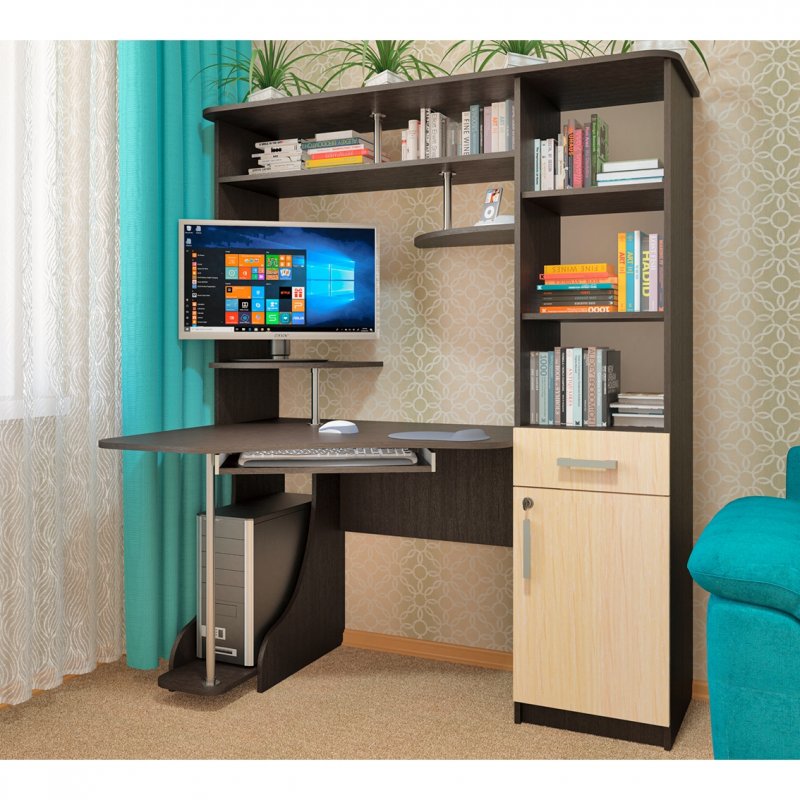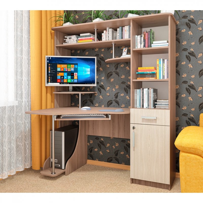 Идеальное соотношение цены и качества, удобство, эргономичность и стиль – всё это компьютерный стол СК-31. Угловая модель – отличный вариант для дома и офиса. Несмотря на небольшие габариты, СК-31 вмещает просторную столешницу с подставкой под монитор и выкатной полкой для клавиатуры. Также есть ниша под системный блок или хранение сумки, портфеля и папок. Правая часть модели состоит из встроенного пенала для документов с открытыми нишами, выдвижным ящиком и небольшим шкафом с распашной дверцей. К тому же шкаф снабжён мебельным замком для удобства хранения важной документации.