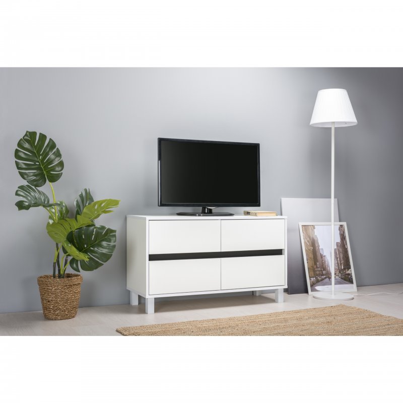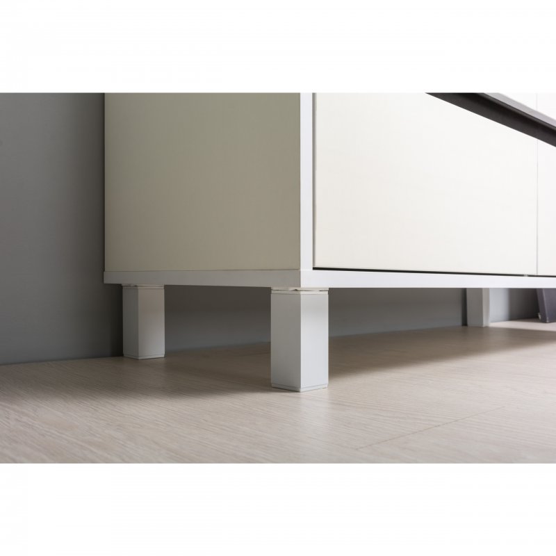 Тумба КВАДРО-это продуманный функционал,лаконичный дизайн и минималистичность форм являются основными свойствами этой тумбы и позволяют ей отлично вписываться в любой интерьер.Корпус тумбы выполнен из белой плиты,выдвижные ящики графично разделены горизонтальной черной полосой из алюминиевого профиля.В столешнице имеется вырез под провода для удобства подключения мультимедиа техники,а регулируемые опоры легко компенсируют неровности пола.